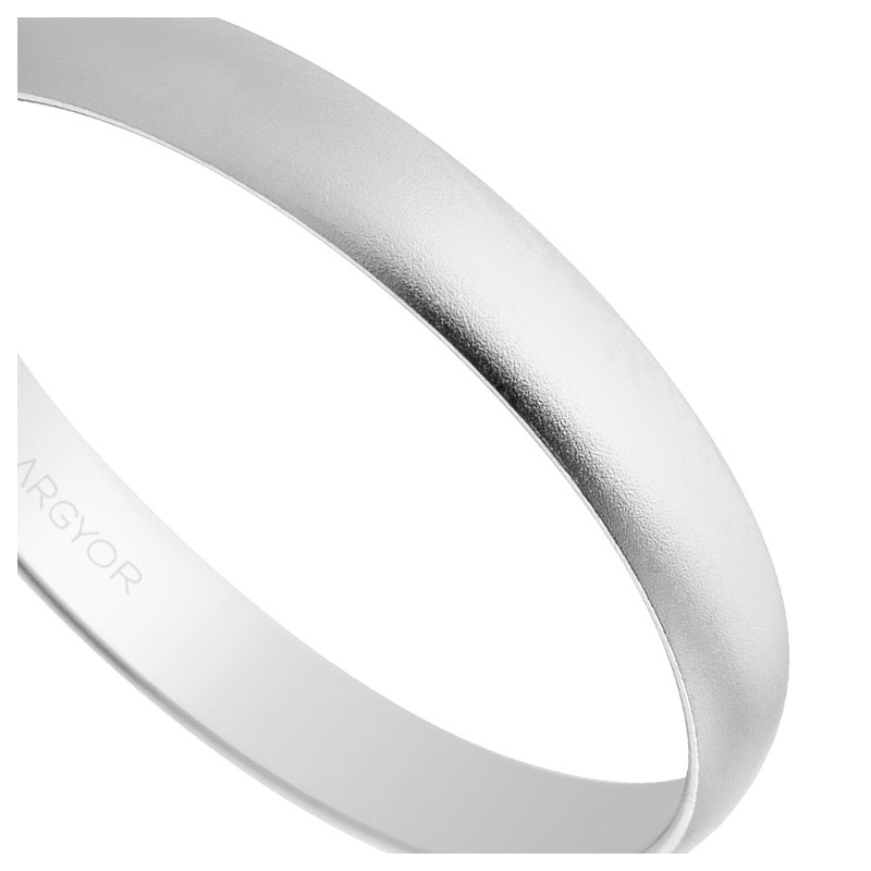La Alianza en oro blanco 18 Ktes destaca por su diseño en media caña, una forma clásica que proporciona un perfil redondeado y suave al dedo. Este estilo tradicional se combina con el acabado de efecto arena, que le confiere una textura única. Con un ancho de 3 mm y un grosor de menos de 1 mm, este anillo resulta ligero y muy cómodo, perfecto para el uso diario. La fusión de un diseño clásico con una terminación moderna hace que esta alianza sea ideal para parejas que buscan un anillo de matrimonio que no solo sea bello, sino también diferente a las opciones más convencionales.