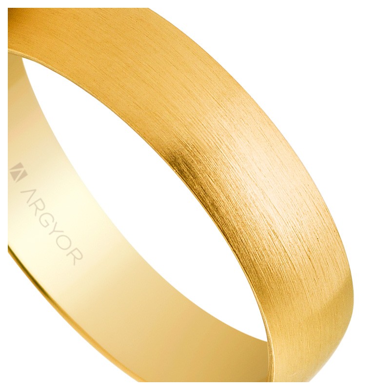 Alianza de oro amarillo 18 ktes, tradicional de media caña, 5 mm de ancho terminacion con textura satinada producida por un cepillado con suaves y sutiles huellas verticales, aproveche la oportunidad de conseguir ahora esta joya a precios muy competitivos.