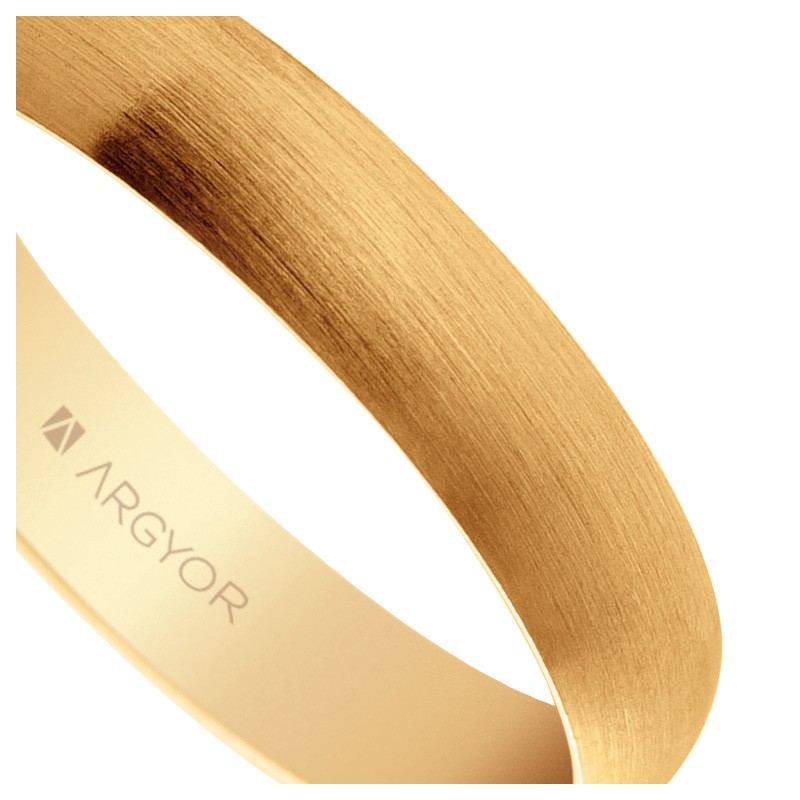 La Alianza de oro amarillo 18 ktes presenta un diseño en media caña de 4 mm de ancho, un estilo que ha perdurado a lo largo del tiempo. Este diseño no solo es estéticamente agradable, sino que también se adapta cómodamente al dedo. El acabado satinado, logrado a través de un cepillado artesanal “scotch”, le da un toque mate y elegante, diferenciándola de las alianzas tradicionales. Este acabado especial realza la belleza del oro amarillo, haciendo que el anillo brille con una luz propia y sofisticada.