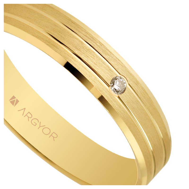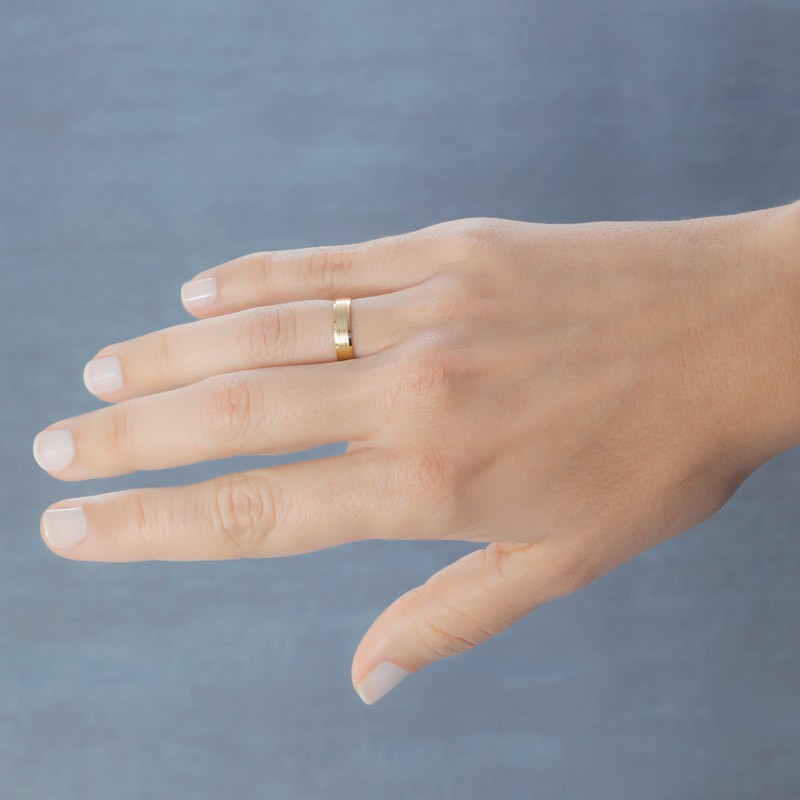 El diseño de la Alianza de oro amarillo se distingue por su superficie plana matizada, que le da un toque moderno y sofisticado. Las dos hendiduras brillantes que recorren longitudinalmente la alianza añaden un contraste visual intrigante, haciendo que esta pieza sea única y atractiva. Este diseño particular es lo que la diferencia de otros modelos, y su elegancia simple la hace adecuada para cualquier ocasión.