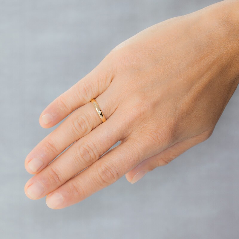 Alianza de oro media caña 3 mm. oro de ley de 18 ktes. con un fino diseño en media caña clásica con un acabado pulido brillante, y un diamante engastado de talla brillante y 0,02 ct, color H y pureza SI, un de los anillos de matrimonio más tradicionales por los que no pasa el tiempo.