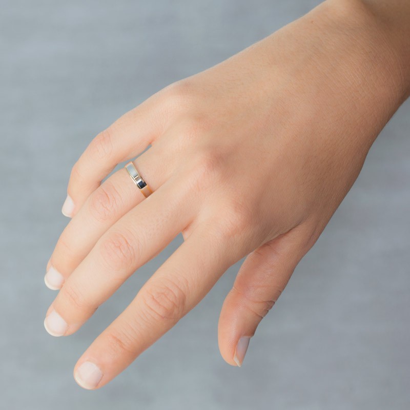 Además, el acabado en brillo de ambos metales añade un toque de lujo y sofisticación que hará que este anillo destaque en cualquier ocasión. Ya sea en la ceremonia de la boda o en el día a día, esta alianza atraerá todas las miradas gracias a su diseño equilibrado y llamativo.