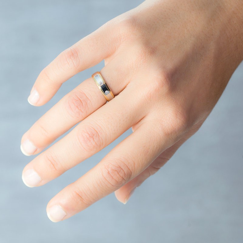 La Alianza de oro bicolor con diamantes no solo destaca por su belleza, sino también por su versatilidad. El diseño contemporáneo y elegante permite que se adapte a diferentes estilos, desde el más clásico hasta el más moderno. Las mujeres pueden lucirla como una pieza principal en ocasiones especiales, mientras que los hombres pueden optar por el mismo modelo sin diamantes, ofreciendo una opción robusta y masculina. Así, cada persona puede encontrar en esta alianza una representación de su estilo personal. Como una prenda de vestir que se adapta a cada evento, esta joya se convierte en un accesorio esencial que trasciende modas y tendencias.