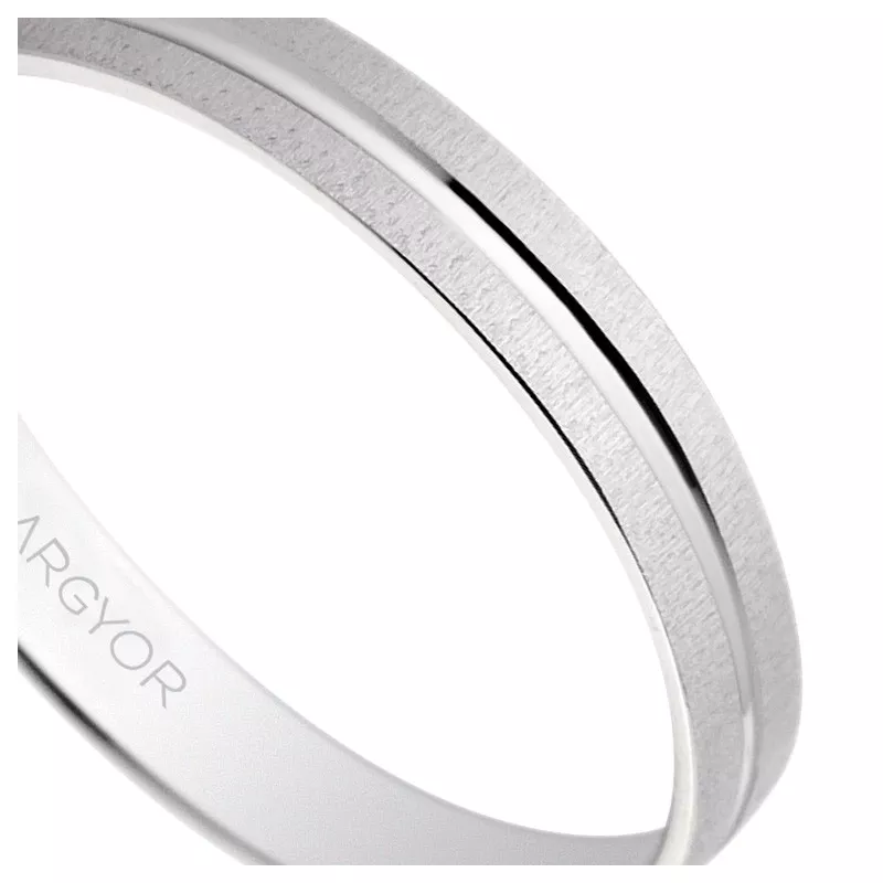 El diseño de la Alianza de oro blanco 9kts es una obra maestra de simplicidad y elegancia. Con un ancho de 3 mm, este anillo es perfecto para aquellos que buscan una pieza que no sea ostentosa, pero que aún así refleje buen gusto y sofisticación. La sección plana y el acabado matizado del anillo están divididos por una hendidura en brillo, creando un contraste atractivo que resalta su diseño limpio y moderno. Este detalle hace que la alianza sea única y llamativa sin ser excesiva.