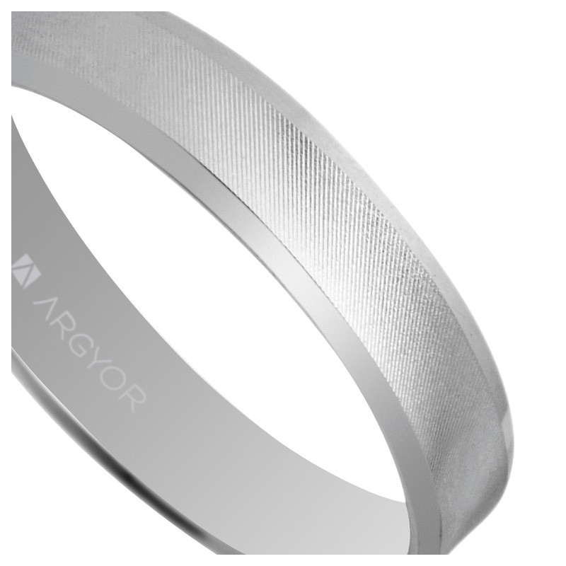 Alianza de plata Argyor fabricada en plata de ley de 4 mm. de ancho banda cóncava con rayado matizado entre biseles brillo, un elegante modelo exactamente con el mismo acabado rodinado que su gemela de oro blanco, las alianzas de plata son perfectas como regalos de compromiso entre novios el día 14 de febrero.