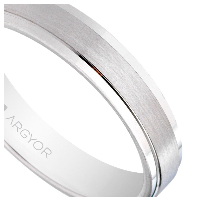 Alianza de plata con baño de rodio, terminación con banda central mate y biseles brillo, 4 milímetros de anchura, con un grosor superior a 1,40 mm, es un anillo con un gran diseño, aparentemente simple muy atractivo para recordar un día especial.