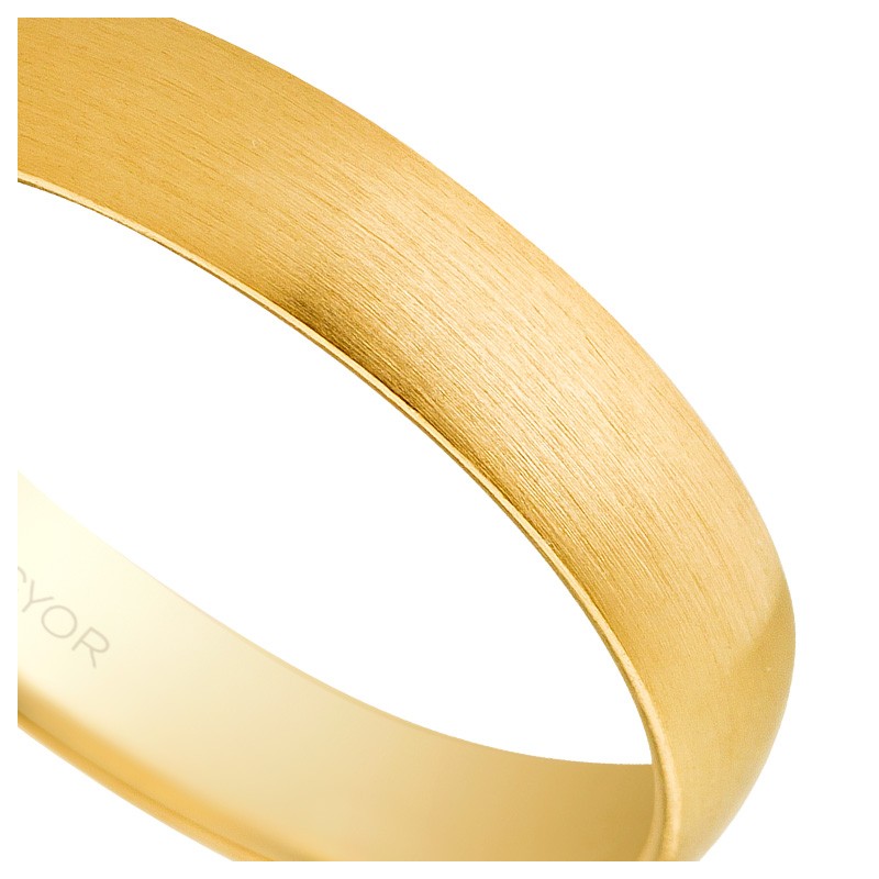 La Alianza en oro 18 ktes se caracteriza por su diseño clásico y su comodidad. La banda de 4 mm tiene una forma de media caña, lo que significa que es ligeramente redondeada en el exterior, ofreciendo un ajuste suave y cómodo en el dedo. Este diseño no solo es estéticamente agradable sino también práctico, ya que se ajusta perfectamente sin causar molestias, incluso si se lleva todo el día. El acabado mate seda le da un toque sofisticado y discreto, perfecto para quienes prefieren un brillo más sutil.