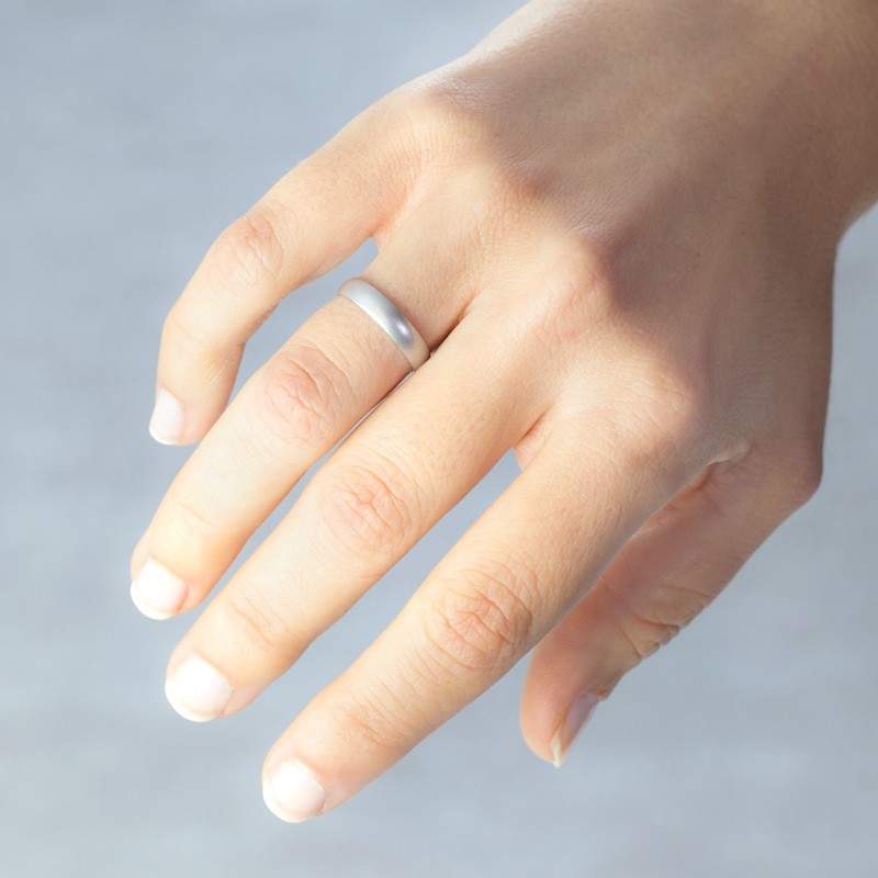 La alianza en oro blanco de 18 kilates destaca por su diseño en media caña, lo que proporciona un ajuste cómodo y natural. Con un ancho de 4 mm, es lo suficientemente prominente para ser notada, pero sin ser ostentosa. El espesor de menos de 1 mm garantiza que el anillo sea ligero y cómodo de llevar durante todo el día. El acabado exterior con efecto arena no solo añade un toque moderno, sino que también asegura que el anillo tenga una textura única y agradable al tacto. Además, el interior plano del anillo asegura que se ajuste perfectamente al dedo, proporcionando una experiencia cómoda y agradable.