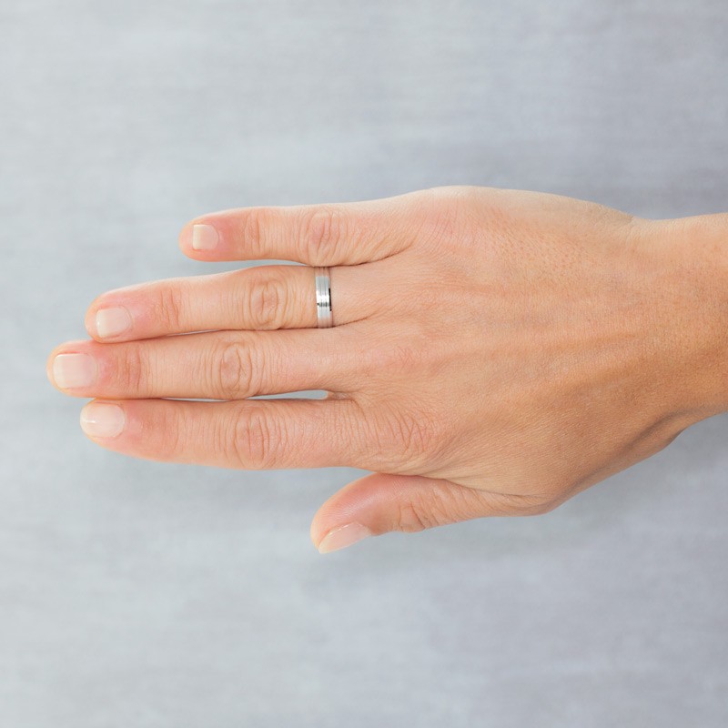 Alianza de boda o matrimonio brazo plano de 4 mm, interior plano muy cómodo para uso diario, con terminación satinada el brazo esta decorado con dos ranuras en brillo, grosor inferior a un milímetro.