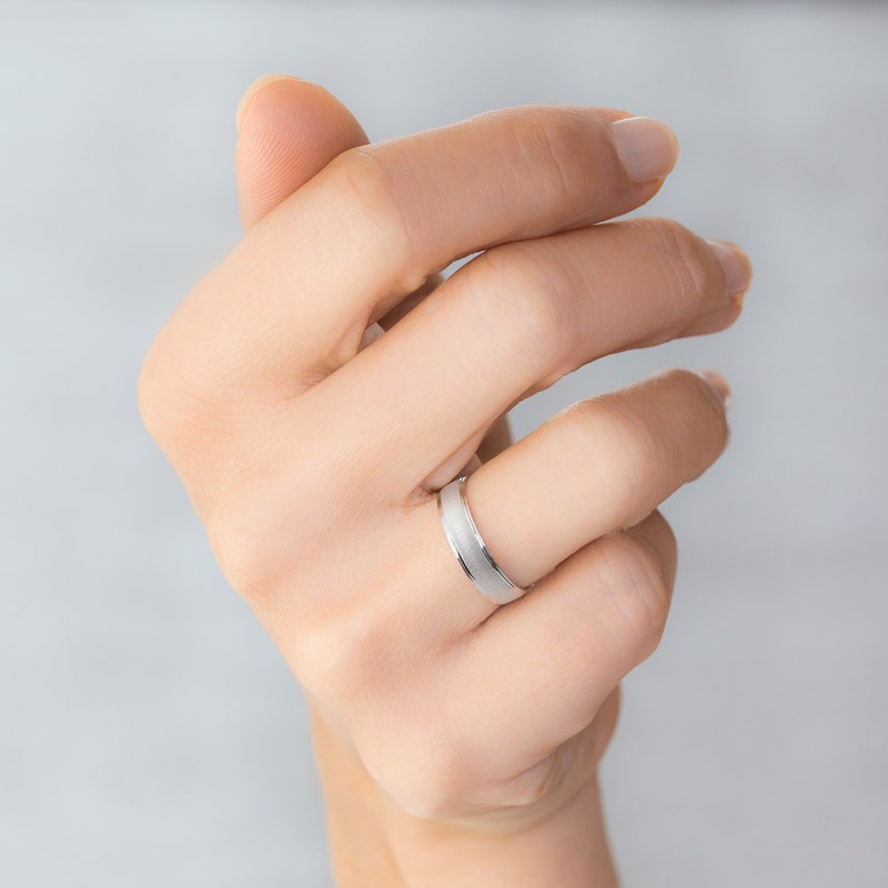 La alianza oro blanco de 18 kilates destaca por su diseño único que combina diferentes acabados. La banda central texturizada en mate aporta un toque moderno y distintivo, mientras que los bordes biselados con terminación brillante añaden un contraste elegante y sofisticado. Esta combinación de texturas convierte a la alianza en una pieza excepcional, ideal para aquellos que buscan algo más que un anillo de diseño tradicional.