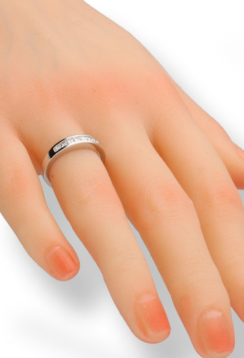 La media alianza resalta con un ancho de 4 mm y un tacto suave que viste la mano con 3.90 gr de oro blanco 18k. Dentro de esta pieza, los 9 diamantes talla princesa, que suman 0.50 quilates, despliegan una secuencia de reflejos intensos incluso en la más suave de las iluminaciones.