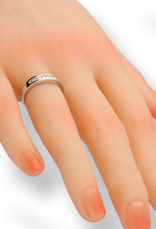 Las 9 gemas talla princesa, sumando 0.38 quilates, configuran una galería de luz en su mano con su inmaculado color H y su pura claridad SI. Este anillo es un lienzo resplandeciente que contempla el presente y el futuro con igual luminosidad.