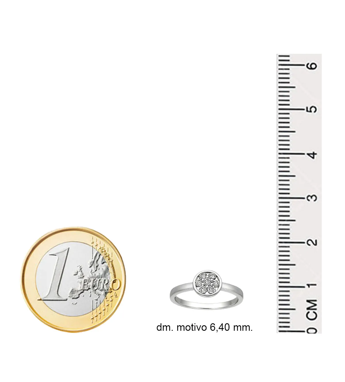 Anillo de compromiso en oro blanco de 18 quilates con siete diamantes talla brillante de engaste invisible. Su chatón circular crea la ilusión de una piedra única que irradia elegancia y amor eterno. Los delicados calados del brazo media caña aportan ligereza y distinción. Una joya atemporal de Rubí Joyeros, la mayor joyería online de España. Compra hoy y haz tu pedida inolvidable.