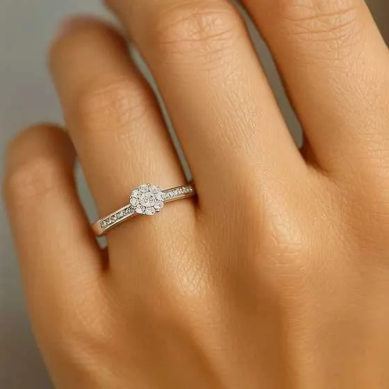 En este modelo, la disposición floral de las piedras añade un toque de romanticismo, evocando el florecer del amor verdadero.