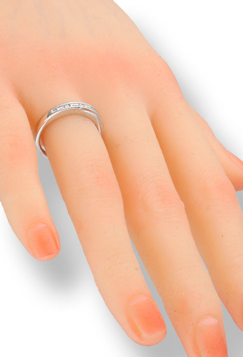 Los diamantes que adornan este anillo no son solo ornamentos; son testigos de la pureza y firmeza de la relación. Seleccionados cuidadosamente para representar la claridad de un amor genuino, cada diamante talla baguette y brillante refleja un compromiso con la calidad y la tradición, cumpliendo con los estándares de color H y pureza SI, tan distintivos de El Rubí Joyeros.