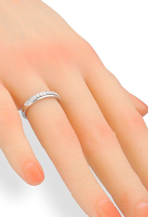 Una media alianza es ideal por su simbolismo de eternidad y amor ininterrumpido, representado por la sucesión continua de diamantes. Es también una opción práctica que permite la combinación con otros anillos y se adapta con elegancia a diversas ocasiones.