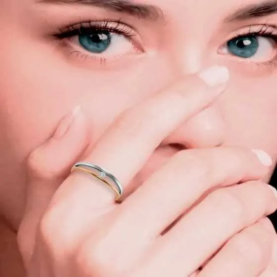 El anillo “ARMONÍAS” representa la unión de dos caminos que se entrelazan con amor y equilibrio. Su diseño bicolor simboliza la complementariedad de la pareja, mientras que el diamante central refleja la fortaleza y pureza del compromiso.
