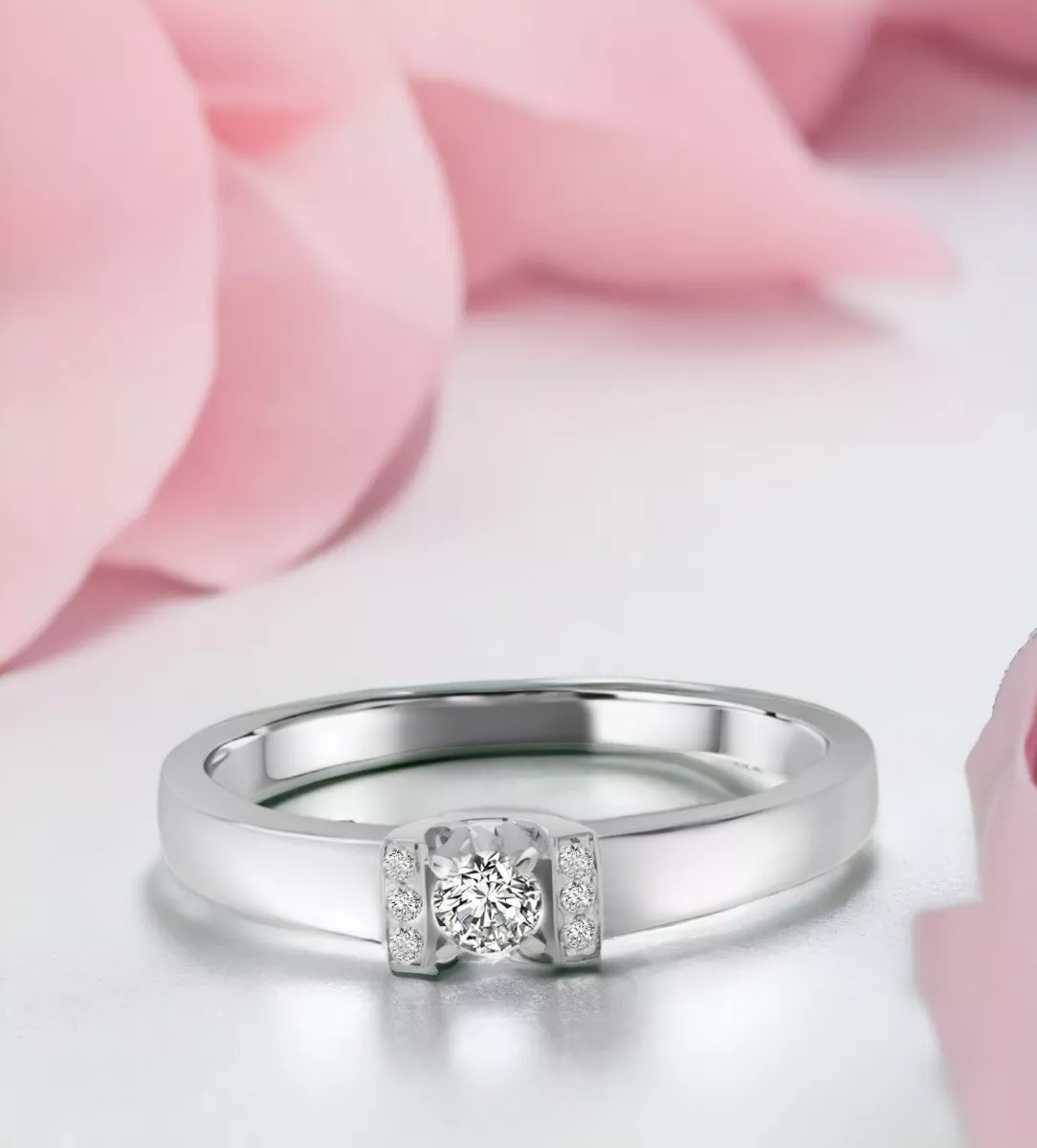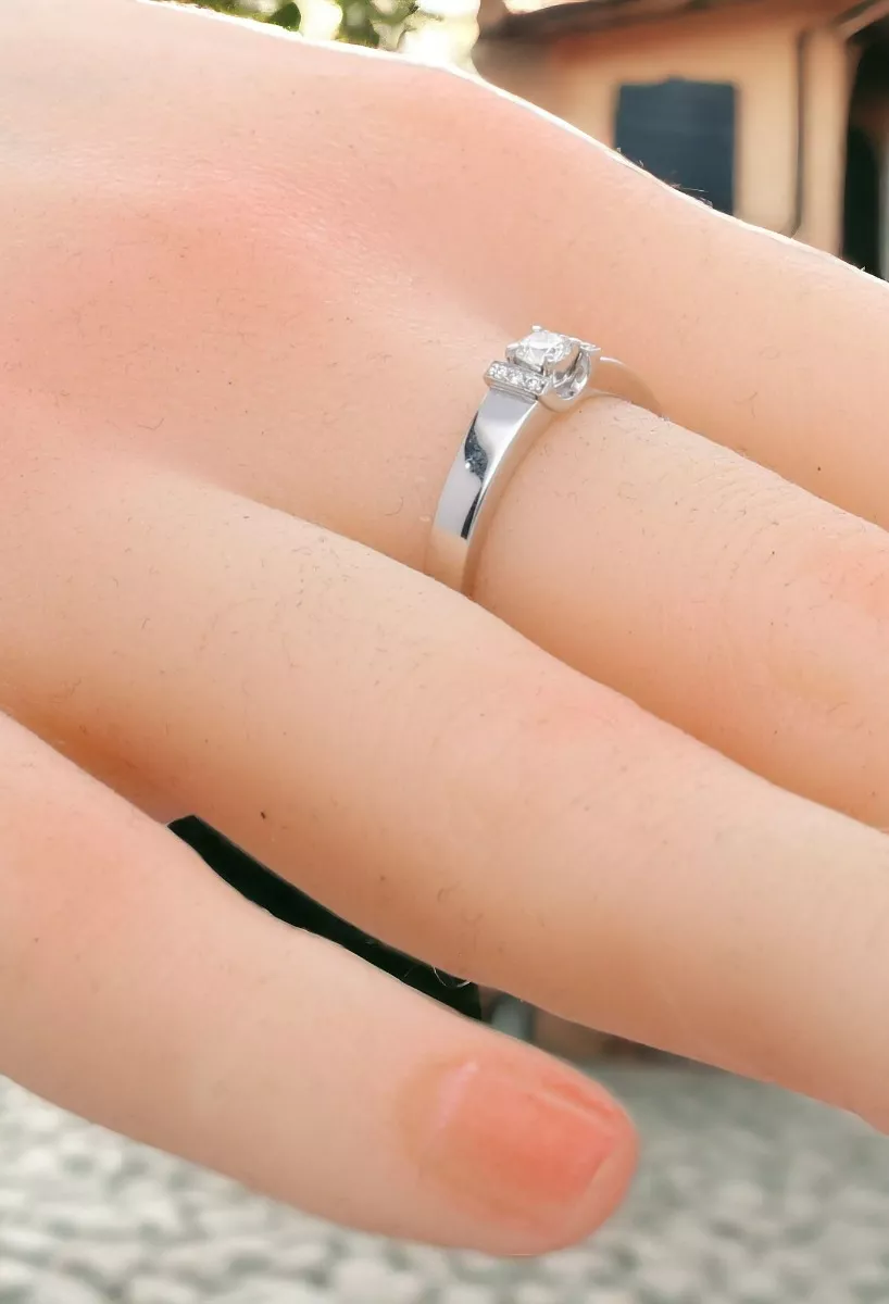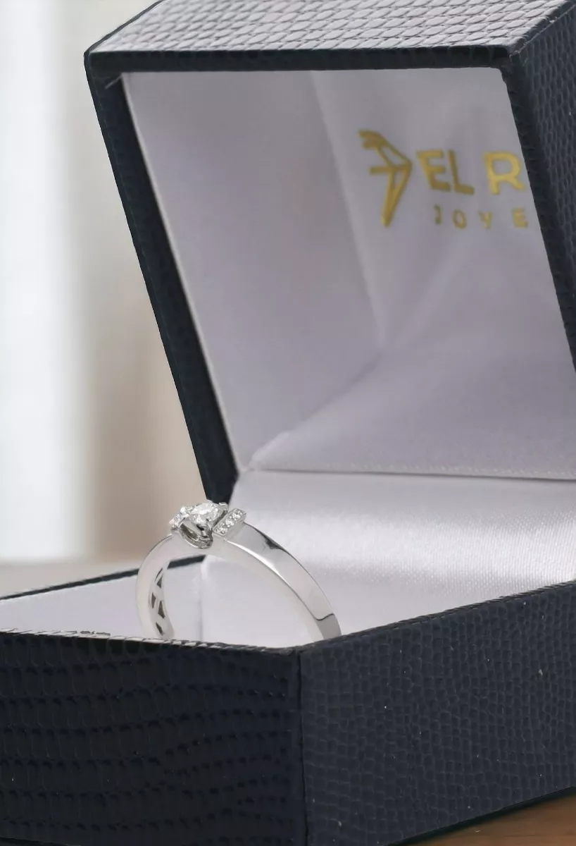 Anillo de compromiso oro blanco 18k con brillantes, Imagina un símbolo eterno de amor elevado a una expresión artística excepcional: nuestro anillo de compromiso en oro blanco de 18 quilates es una obra maestra que fusiona elegancia clásica con un diseño innovador. Este cautivador anillo presenta un deslumbrante diamante talla brillante, meticulosamente engastado en garra con una encantadora forma de ‘C’. A ambos lados del diamante central, deslumbran dos pequeñas galerías, cada una adornada con tres brillantes, creando un equilibrio armonioso y resplandeciente.
