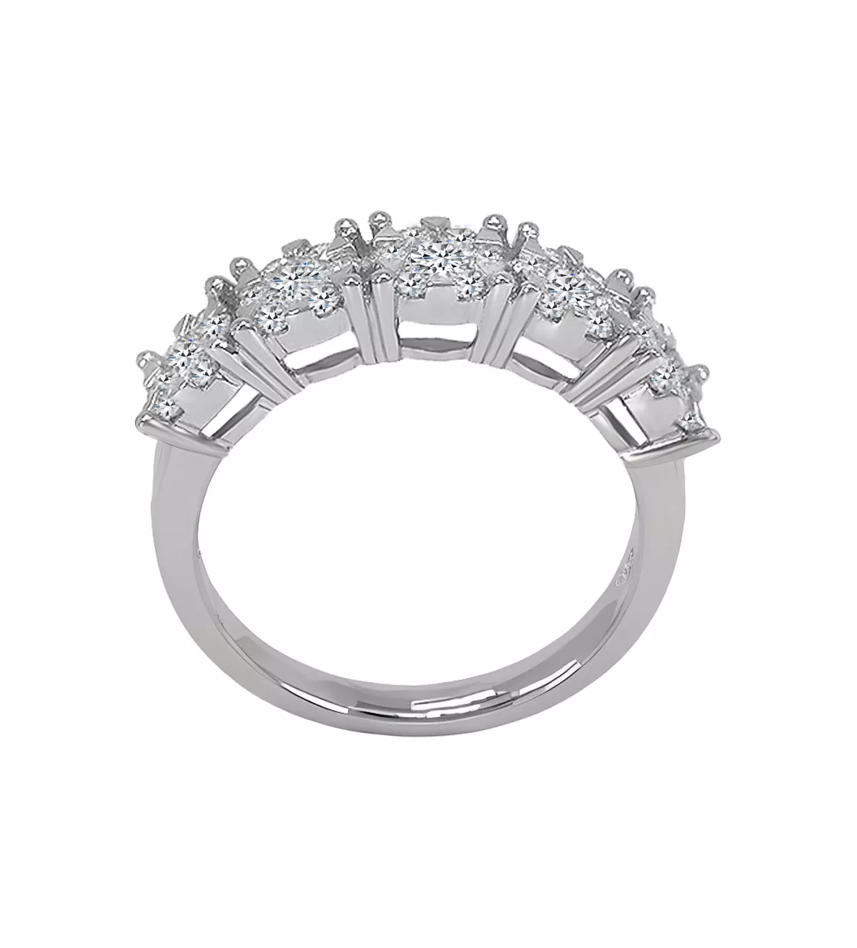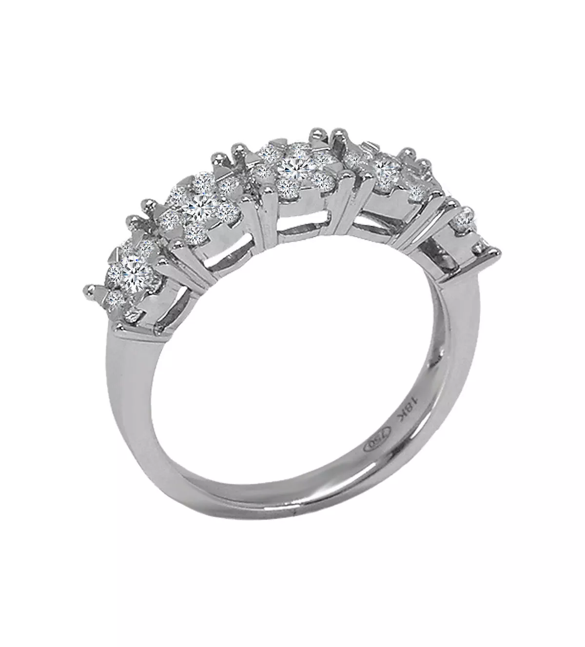 El diseño del anillo “Coronas” es una perfecta armonía entre la tradición y la modernidad. La estructura principal del anillo está formada por cinco grupos de diamantes, cada uno compuesto por un brillante central rodeado por seis diamantes más pequeños. Este diseño crea la ilusión de que el anillo contiene cinco grandes piedras de medio quilate, cuando en realidad se trata de un sofisticado juego de proporciones que maximiza el brillo y el impacto visual de la joya.