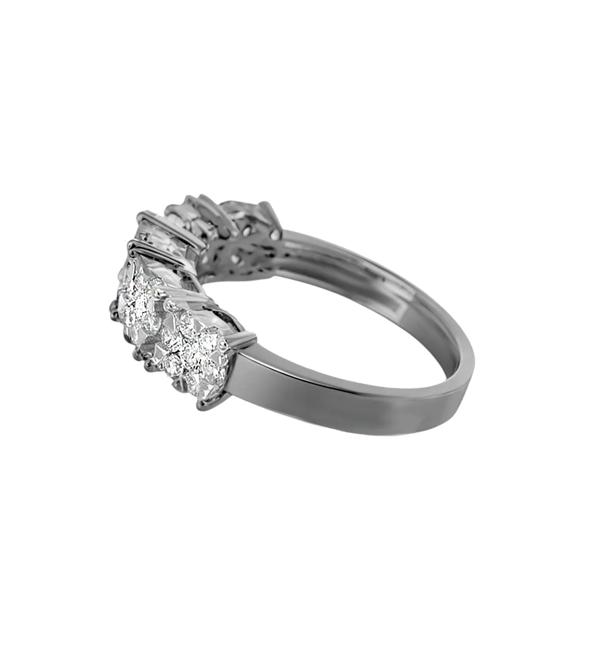 Este magnífico anillo está fabricado en oro blanco de primera ley de 18 kilates, un material conocido por su durabilidad y su capacidad para realzar el brillo natural de los diamantes. El acabado en rodio le proporciona una capa extra de protección y luminosidad, asegurando que el anillo mantenga su esplendor con el paso del tiempo. Los diamantes de talla brillante que componen esta pieza son de color H y pureza VS1, una combinación que garantiza que el anillo ofrezca un brillo espectacular desde todos los ángulos.