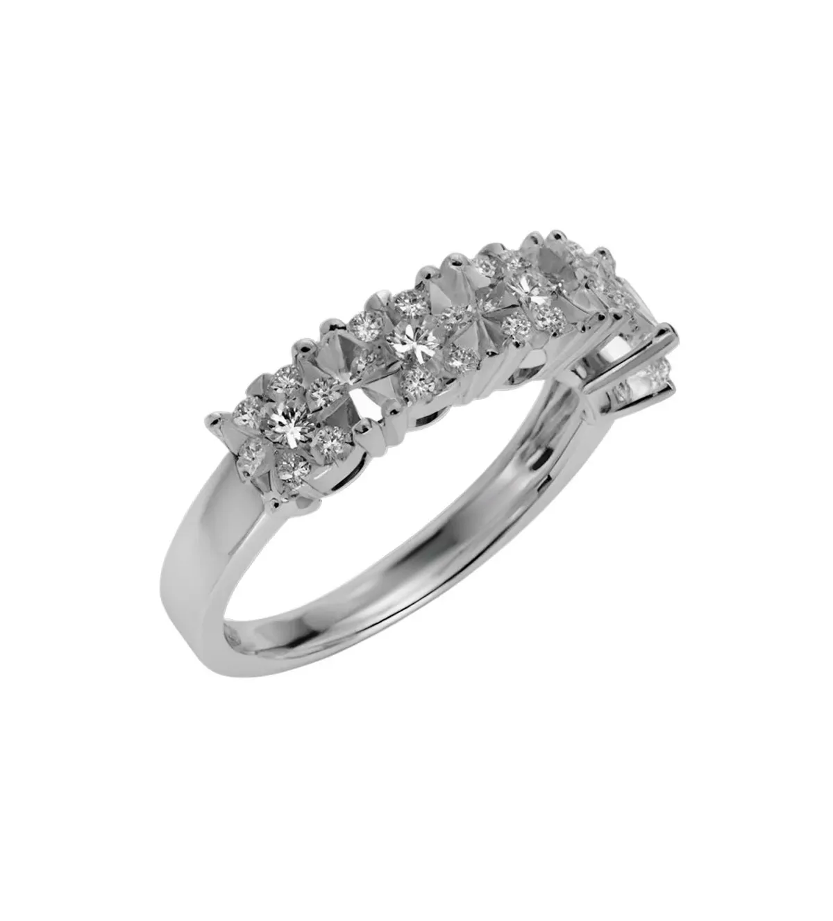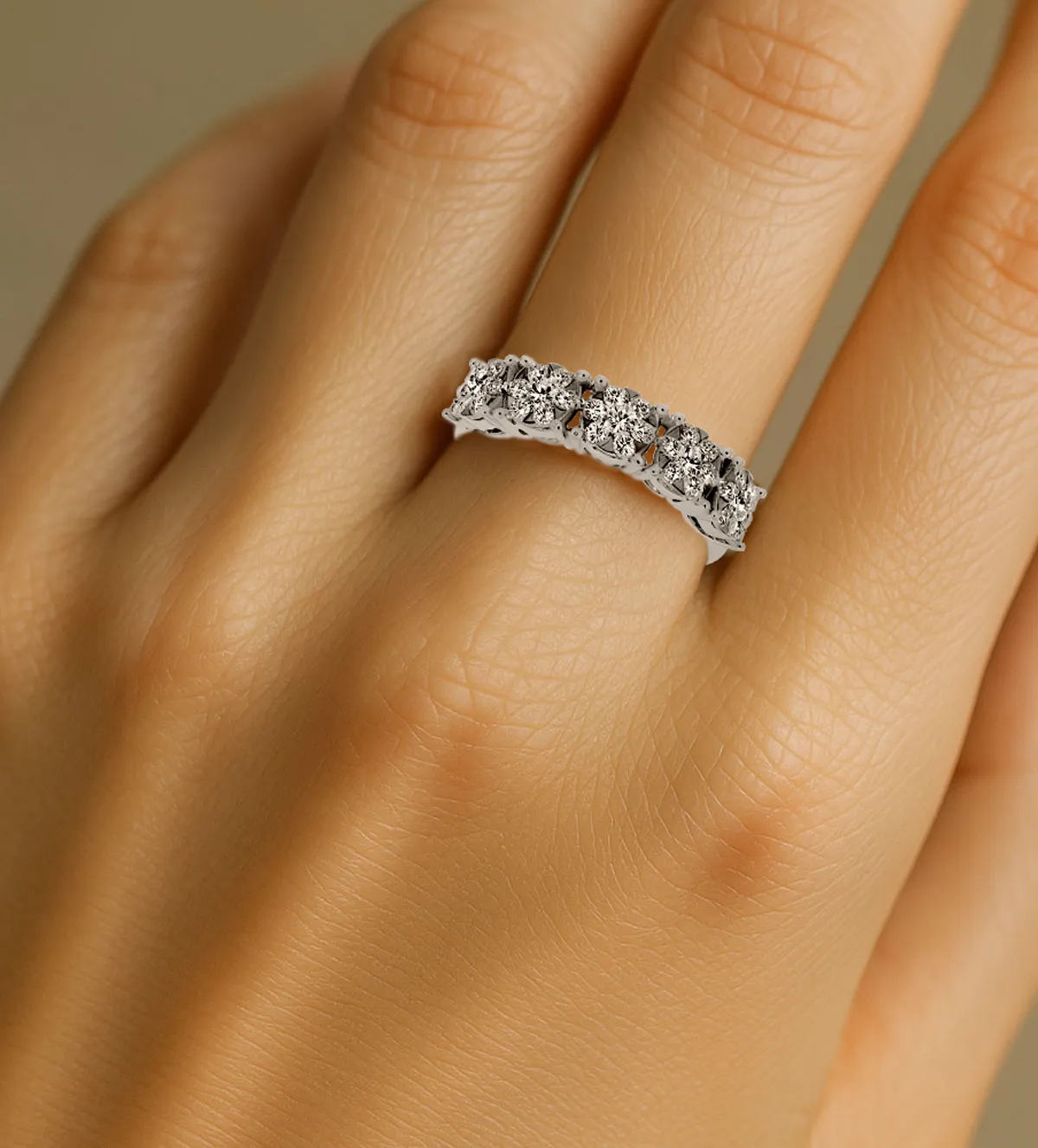 Lo que realmente hace especial al anillo “Coronas” es su capacidad para captar la luz de manera excepcional. Gracias al diseño de los brillantes y el engaste invisible, cada movimiento de la mano produce un destello impresionante que atraerá todas las miradas. Este anillo es una pieza que combina innovación y elegancia, haciendo que parezca que lleva diamantes de mayor tamaño del que en realidad tienen, lo que maximiza el impacto visual sin sacrificar la comodidad.