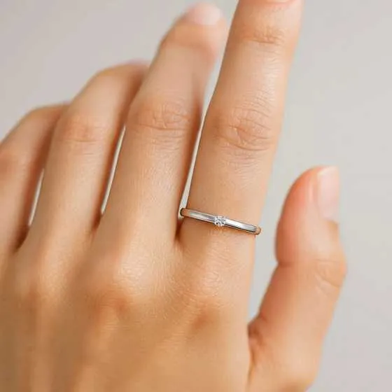 El diseño minimalista, sin adornos innecesarios, resalta la belleza del diamante y el simbolismo del compromiso puro.