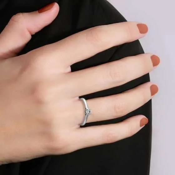 Fabricado en oro blanco de 18 quilates, este anillo combina resistencia y elegancia, garantizando un brillo duradero con el paso del tiempo. El diamante talla brillante, cuidadosamente seleccionado, asegura un destello espectacular desde cualquier ángulo, reflejando el amor puro y sincero.