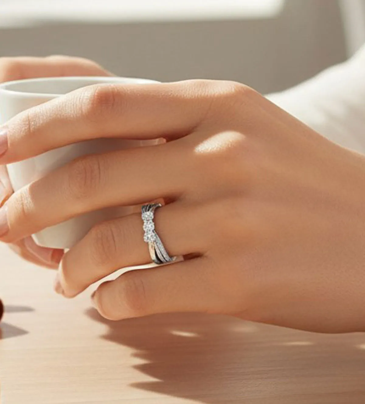 El anillo de compromiso es, por definición, un símbolo de amor eterno y promesa de futuro. En este diseño, el cruce de los brazos representa el encuentro de dos caminos que se unen para formar uno solo. Los diamantes, por su dureza y brillo, simbolizan la fortaleza del vínculo, la pureza de los sentimientos y la durabilidad del compromiso adquirido.