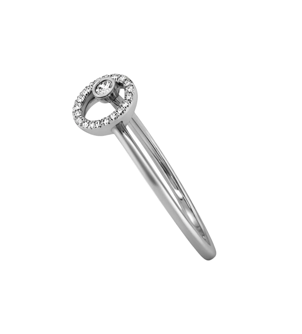 Lo que distingue a este anillo es su diseño asimétrico y simbólico. El brazo fino de la sortija otorga todo el protagonismo al motivo principal, creando una estética equilibrada entre lo moderno y lo atemporal. La orla circular representa el amor eterno, mientras que el diamante central desplazado añade un toque de originalidad y profundidad emocional.