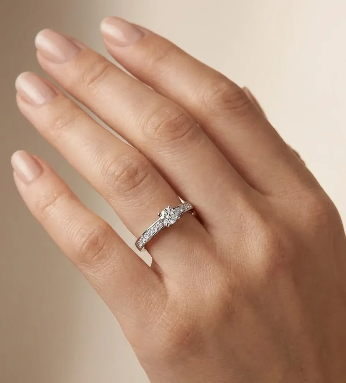 La base de este exquisito anillo de compromiso oro blanco 18K y diamantes de 0.57 ct es el metal noble escogido: el oro blanco. No es simplemente una elección estética; es una promesa de durabilidad y un compromiso con la calidad que DUOO garantiza en cada una de sus creaciones.