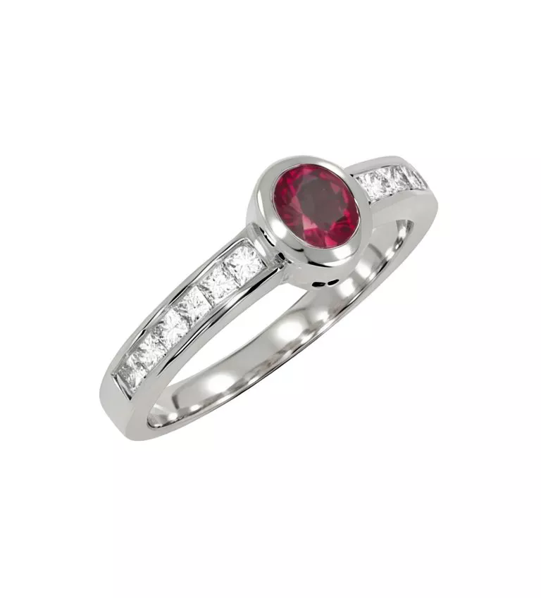 Deslumbra con este anillo de oro blanco. Rubí oval y diamantes princesa. Perfecto para cualquier ocasión.