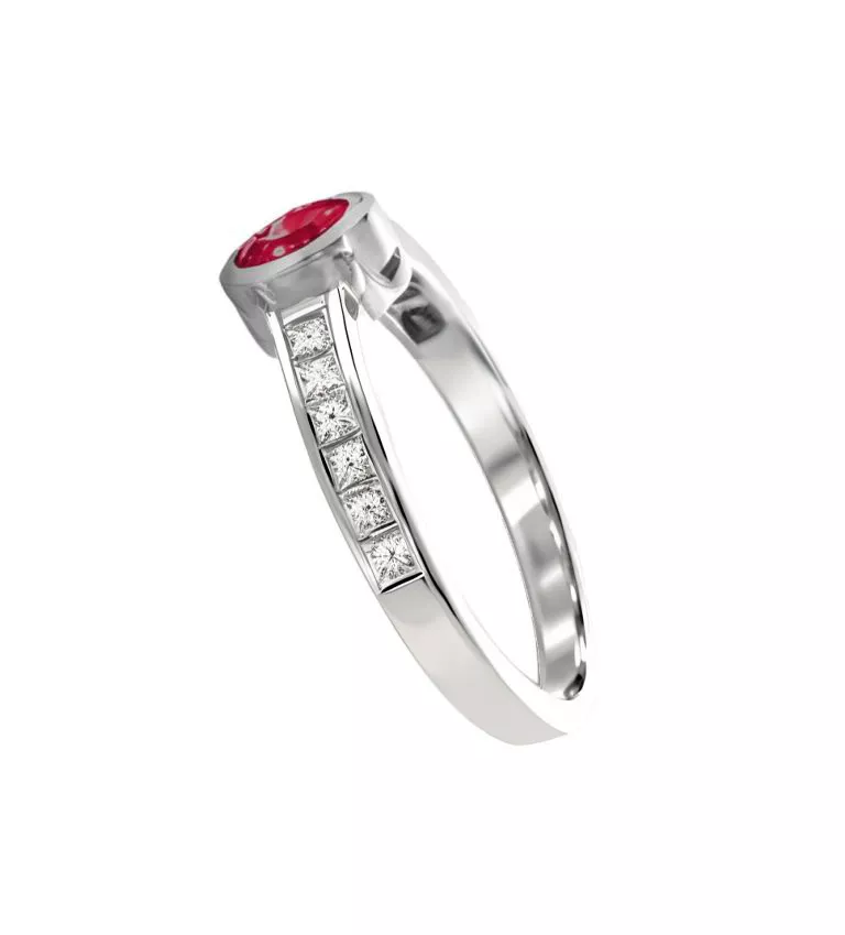 Lo que hace especial a este anillo de oro blanco no solo es su belleza, sino también la combinación de piedras preciosas cuidadosamente seleccionadas. Los diamantes talla princesa reflejan la luz desde todos los ángulos, ofreciendo un destello continuo y elegante. El rubí ovalado en el centro añade un toque de color vibrante, simbolizando amor y pasión. Además, la disposición en carril de las piedras crea una continuidad visual que alarga la apariencia del dedo, haciéndolo ver más estilizado.