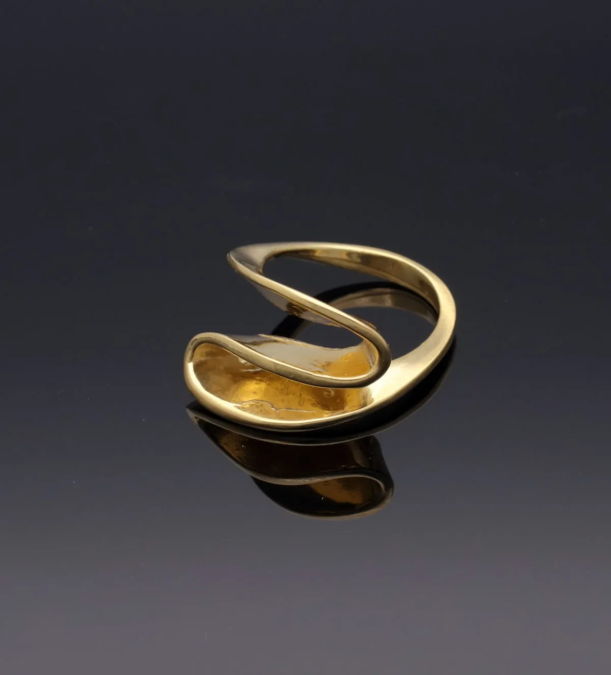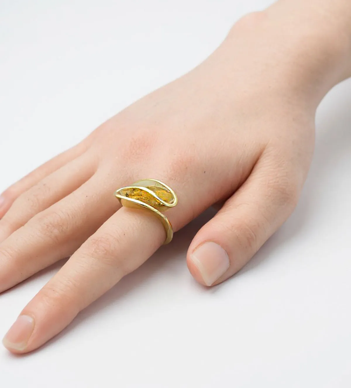 Su presencia es evidente: un anillo de plata chapada en oro que destaca por sí solo y complementa con fuerza cualquier atuendo.
