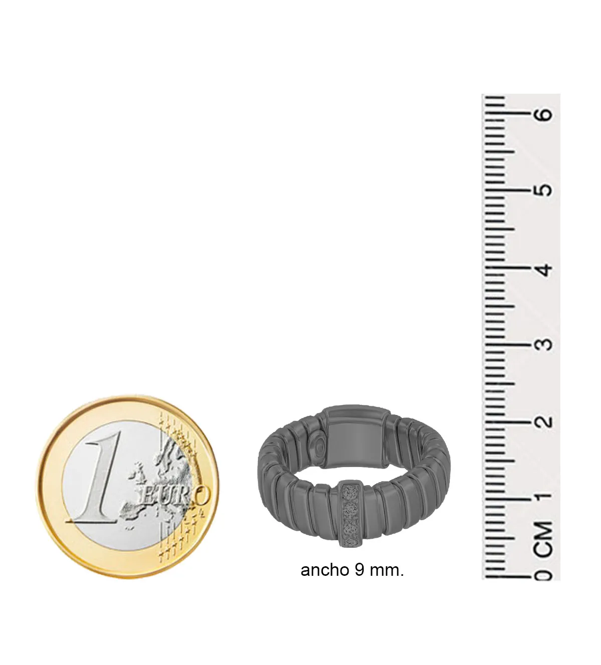 El anillo cuenta con un ancho de 9 mm y un peso aproximado de 3,70 g, dimensiones ideales para lucir presencia sin sentirse pesado. Su estructura envolvente proporciona un ajuste seguro y delicado, pensado para adaptarse cómodamente al dedo. El equilibrio entre diseño y ergonomía hace de esta pieza una elección perfecta para el uso diario o eventos especiales.