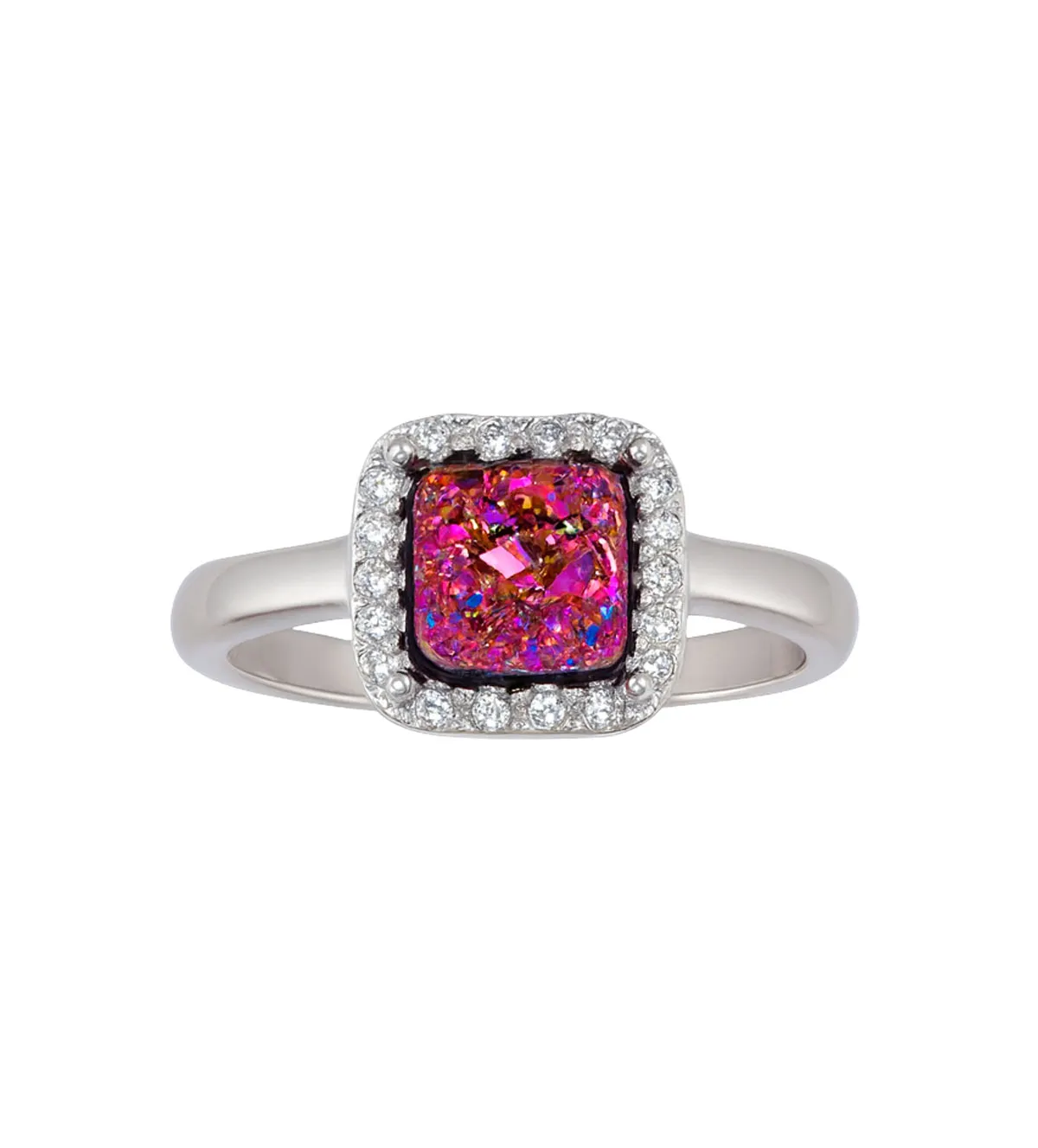 El diseño de este anillo de plata combina líneas limpias con un toque artístico muy actual. El brazo abierto en su parte inferior no solo aporta originalidad, sino que también permite una adaptación perfecta a distintas medidas de dedo. El motivo central de forma cuadrada, con unas dimensiones de 9 milímetros por cada lado, crea un equilibrio visual ideal entre presencia y discreción. La combinación de la ágata drusa multicolor con el contorno de circonitas convierte cada anillo en una joya con matices propios, ya que no hay dos piedras exactamente iguales.