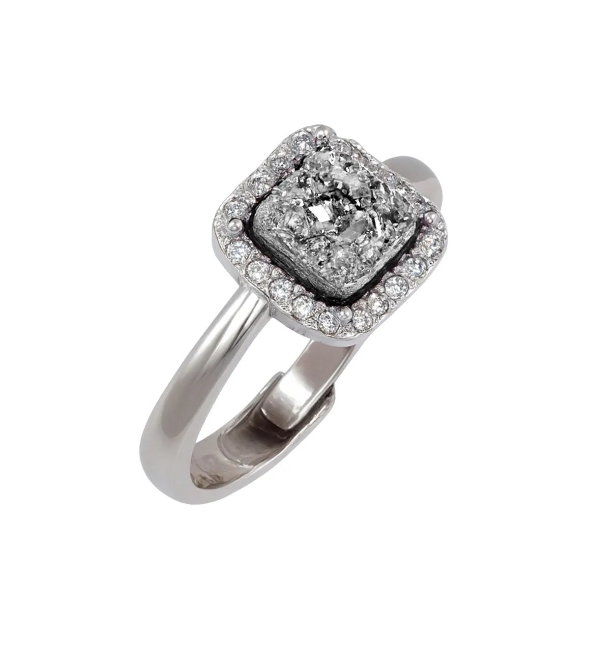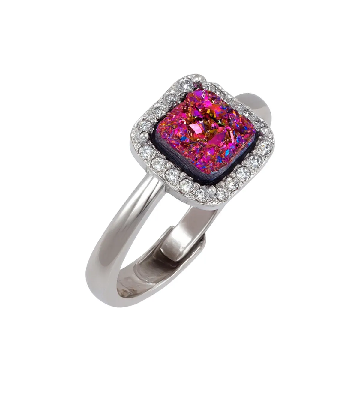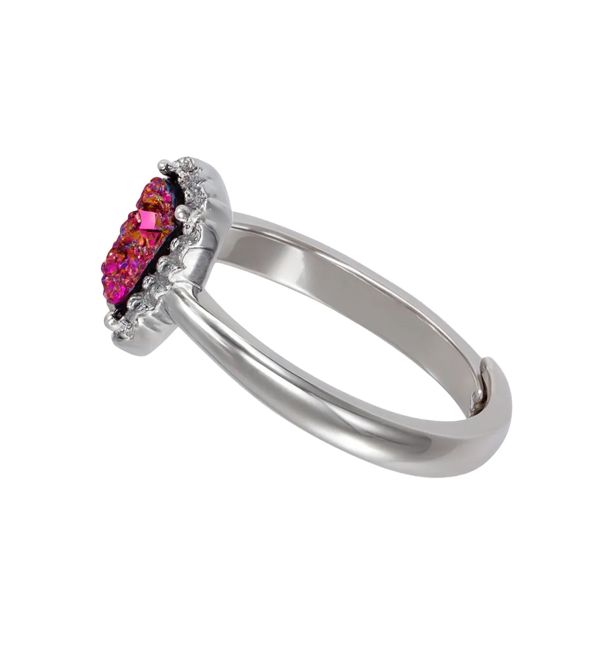 El anillo está elaborado en plata de ley, un material reconocido por su resistencia, durabilidad y brillo atemporal. La plata utilizada ha sido cuidadosamente seleccionada para garantizar una excelente conservación con el paso del tiempo y un acabado refinado que mantiene su luminosidad uso tras uso. El motivo central está protagonizado por una ágata drusa coloreada en distintos tonos, una piedra natural valorada por su textura cristalina y su capacidad para reflejar la luz de forma única. Rodeando el motivo se encuentra un delicado bisel de circonitas que aporta un contraste brillante y elegante, elevando el valor estético de la pieza.