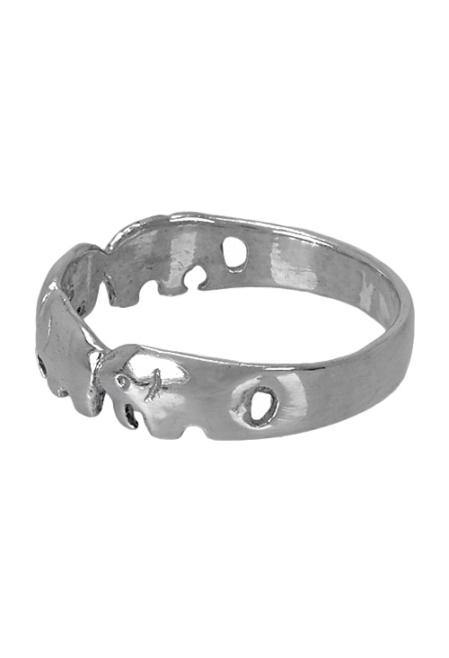 Sortija de plata de ley con acabado en brillo con un divertido y juvenil diseño de una hilera de elefantes, un animal sagrado que suele representar la paciencia el honor y la fuerza, una joya para mujer muy desenfadada pero cómoda de llevar a diario que puede encontrar en nuestra web al mejor precio, un buen regalo para multitud de ocasiones, tiene un peso total de 2,7 gramos.