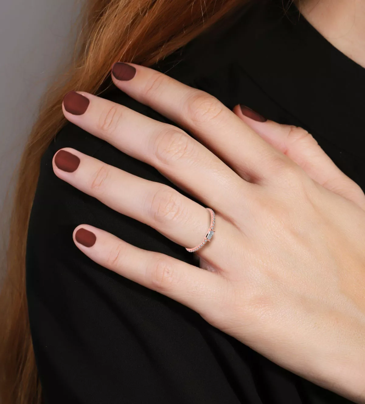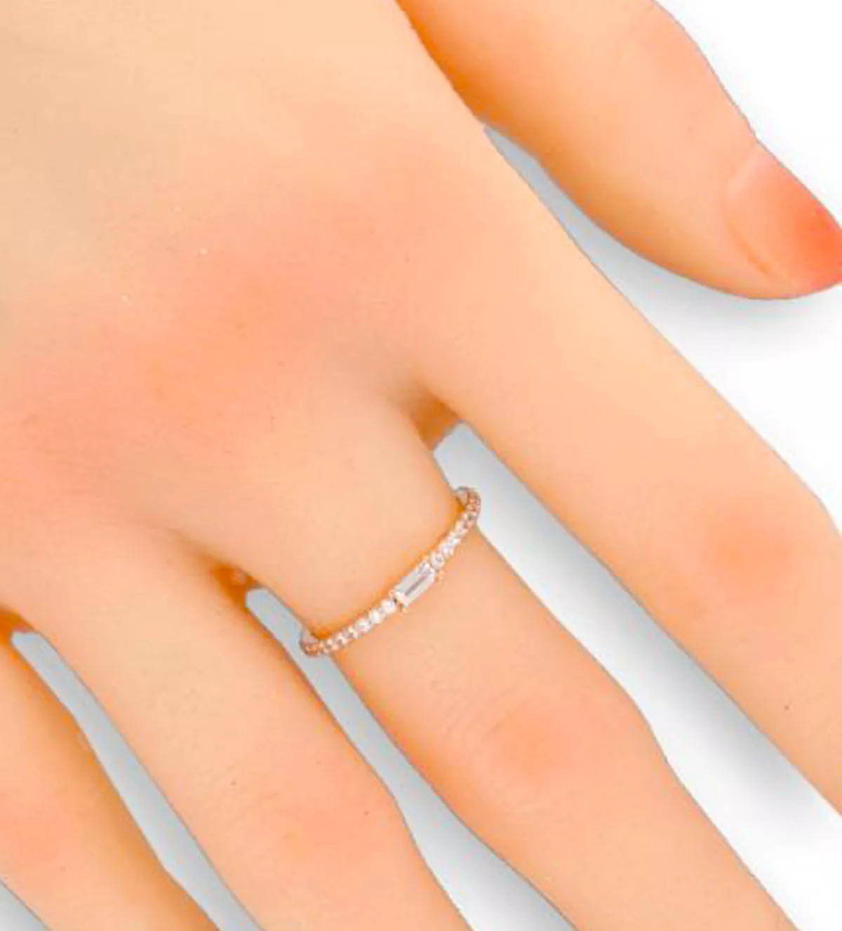 El diseño del anillo de oro rosa incluye una impresionante circonita central con talla baguette, cuidadosamente seleccionada por su claridad y brillo. La talla baguette, con su forma rectangular y facetas paralelas, proporciona un destello lineal que añade una elegancia moderna al anillo. Las 22 circonitas adicionales, dispuestas simétricamente a lo largo del brazo del anillo, ofrecen un brillo continuo que capta la luz desde todos los ángulos, convirtiendo esta joya en un verdadero espectáculo visual.