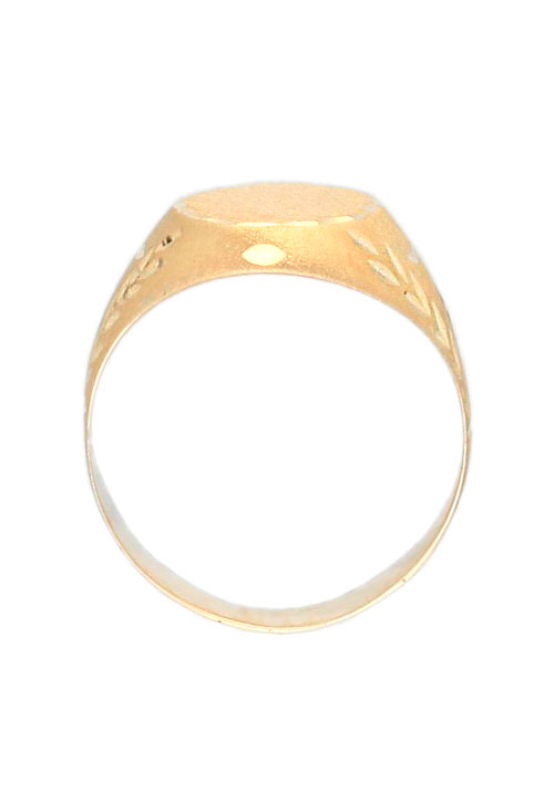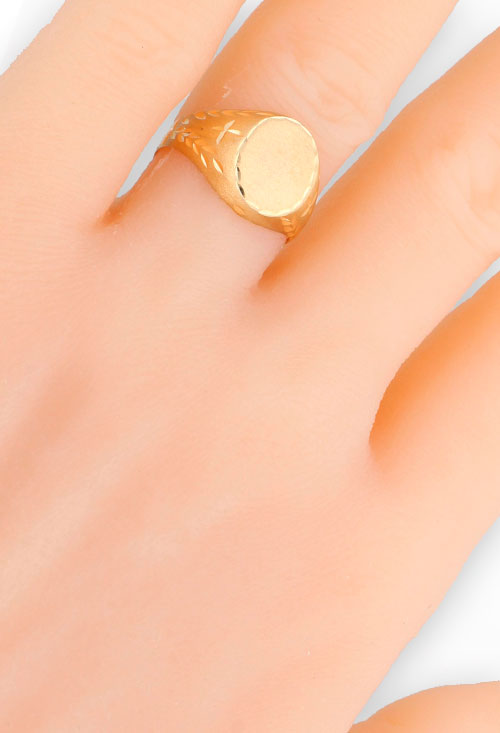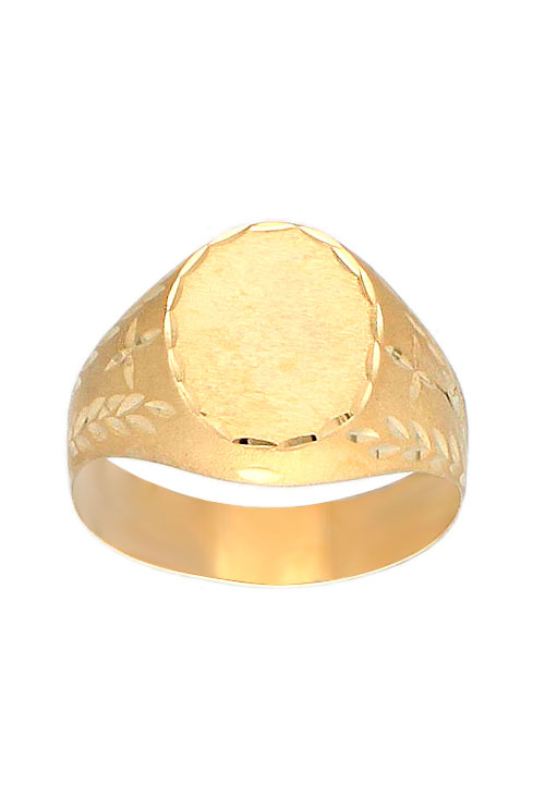 Sello hombre oro amarillo 9 kilates, Anillo de oro tipo sello que muestra la parte superior con forma circular y matizada, un espacio plano ideal para grabar iniciales o un escudo. en los laterales de la parte superior del anillo discurren dos hombreras con cortes lapidados que conforman motivos florales.