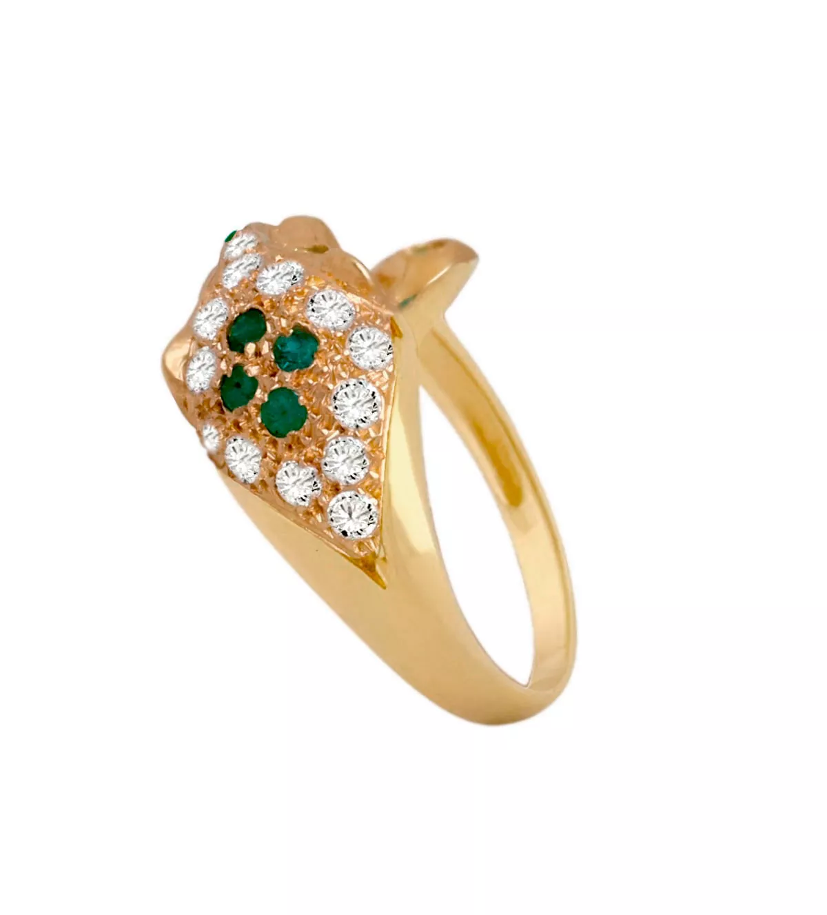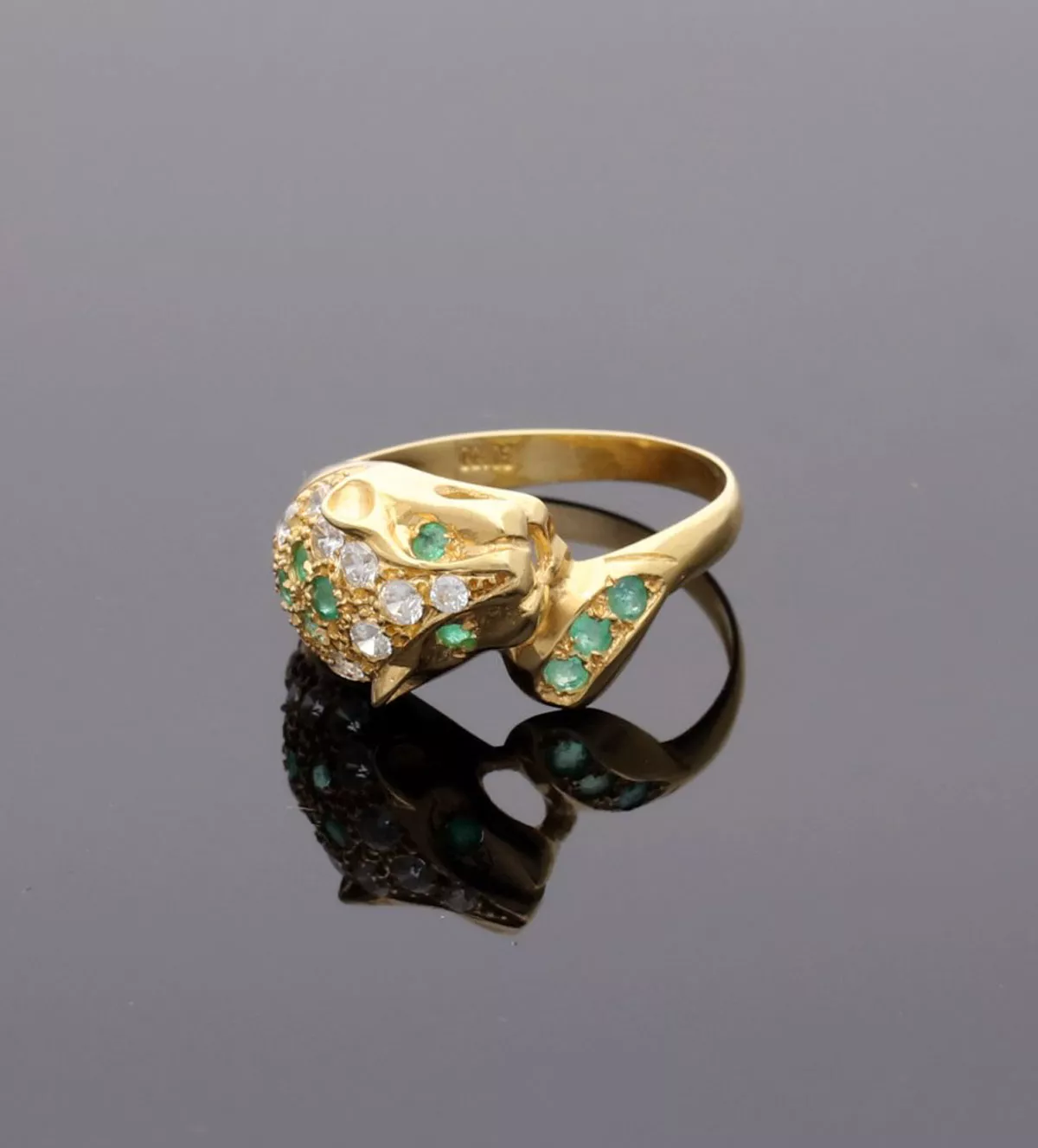 Anillo de oro 18ktes cabeza de pantera cuajada de circones y esmeraldas.