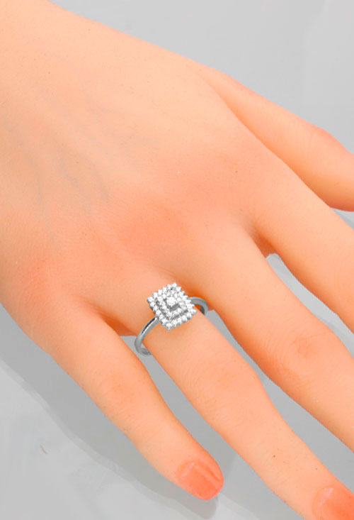Anillo de oro blanco y circonitas doble orla, una circonita central que esta engastada en garra y rodeada por una orla doble de circonitas con forma rectangular en dos alturas diferentes, dispone de un brazo liso de cuchilla, acabado baño de rodio, una joya especial para lucir en las mejores ocasiones.