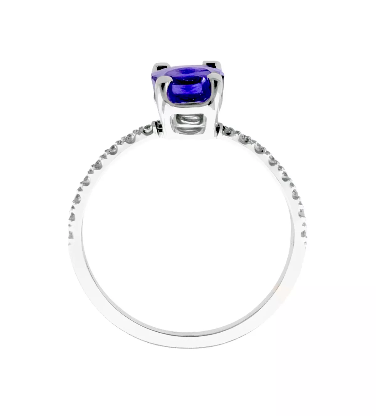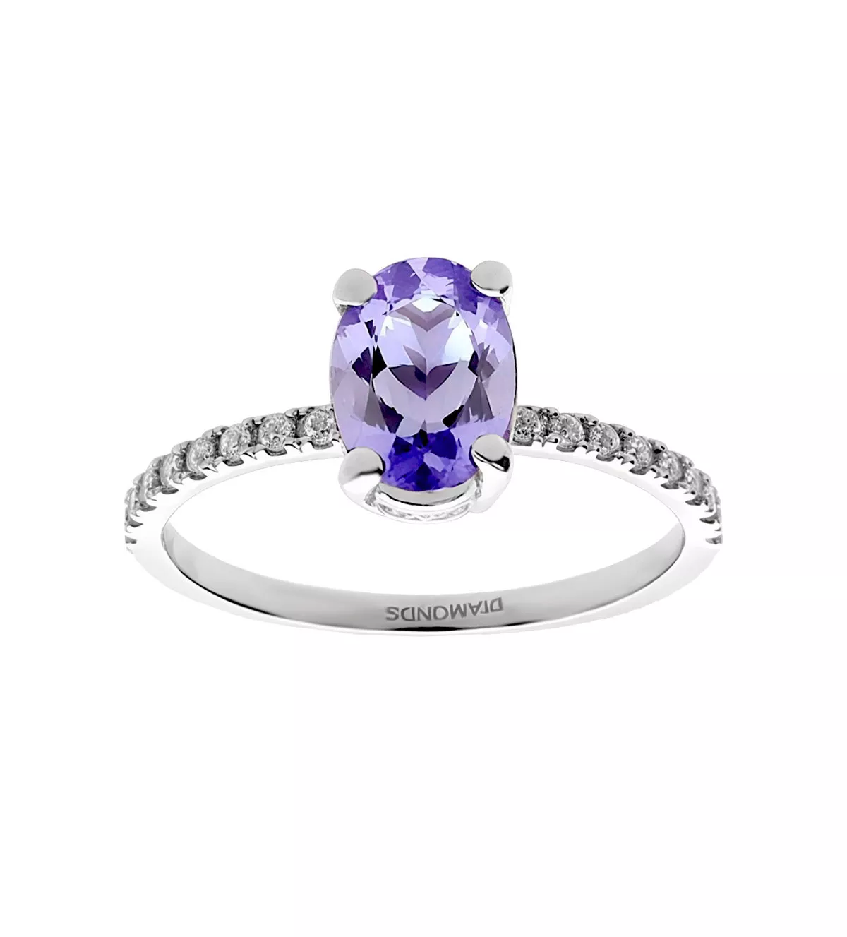 Este anillo se fabrica en oro blanco, un material resistente y duradero que aporta un brillo elegante y sofisticado. El oro blanco es conocido por su aspecto moderno y su capacidad para resaltar el color y el brillo de las piedras preciosas. En esta pieza, una tanzanita de talla ovalada, con medidas de 6×8 mm, ocupa el lugar central. La tanzanita es una piedra preciosa que cautiva por su color azul profundo, aportando a la sortija un aire místico y refinado. A cada lado, 8 diamantes talla brillante adornan el brazo del anillo, añadiendo destellos deslumbrantes que elevan la presencia de la tanzanita y maximizan su belleza.