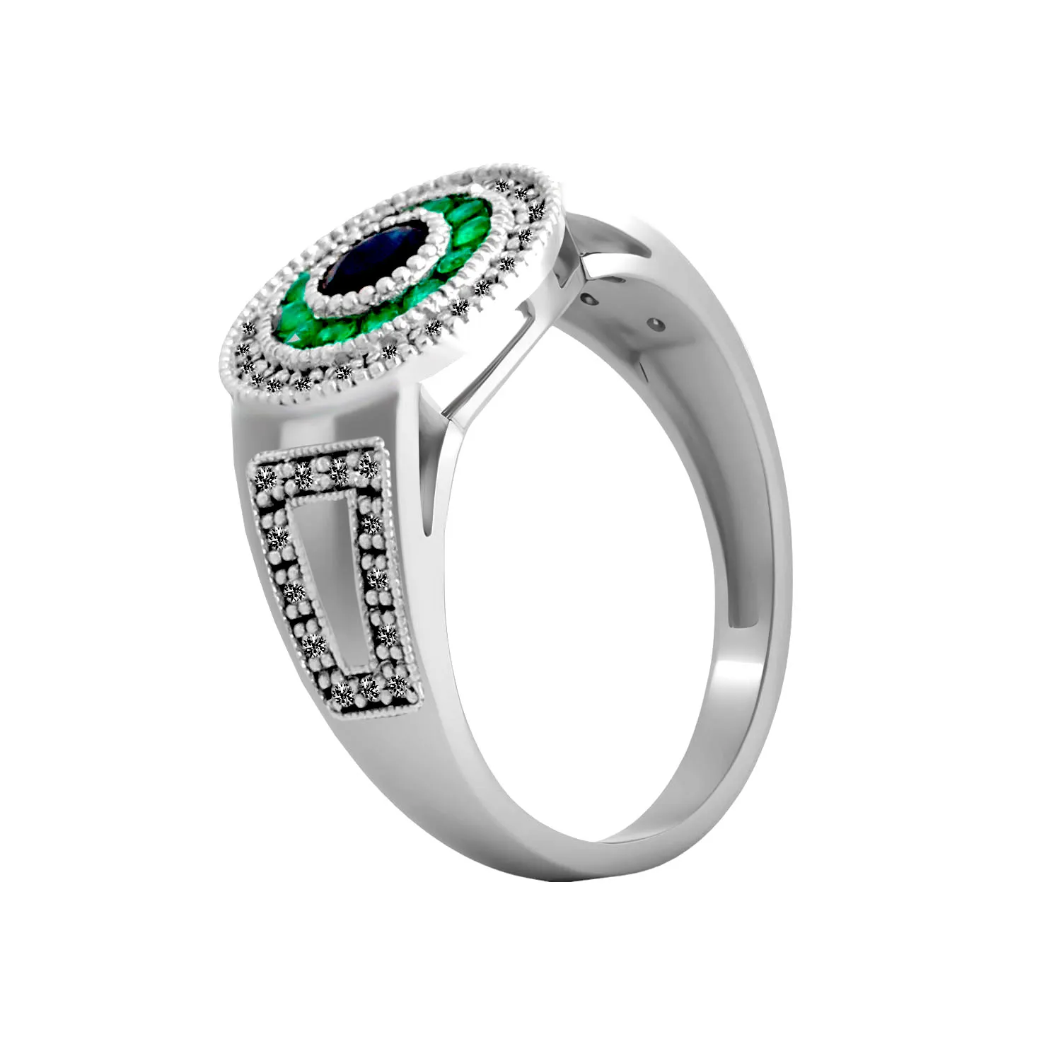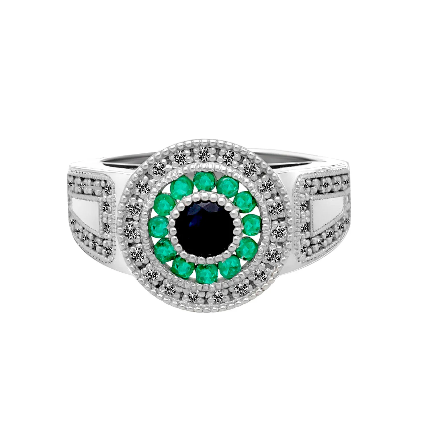 Fabricado en oro blanco de 18 quilates, este anillo garantiza durabilidad y brillo eterno. El zafiro central, de un azul profundo, está rodeado por dos orlas de brillantes y esmeraldas, creando un contraste cautivador. Los pequeños brillantes incrustados en el brazo refuerzan su elegancia.