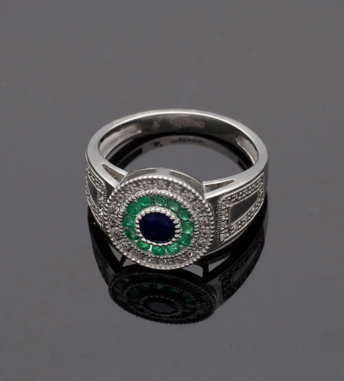 El zafiro es una piedra preciosa asociada con la sabiduría, la lealtad y la nobleza. Se cree que aporta claridad mental y protección a quien lo lleva. Combinado con las esmeraldas, que simbolizan la esperanza y el amor, este anillo es más que una joya, es un amuleto de energía positiva.