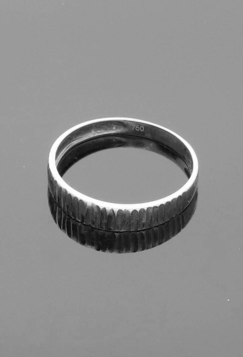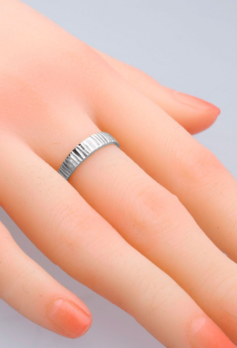 Anillo de oro blanco para mujer, brazo en disminución con adornos longitudinales a modo de gallones efecto mate y brillo, perfecto para acompañar a otras sortijas.
