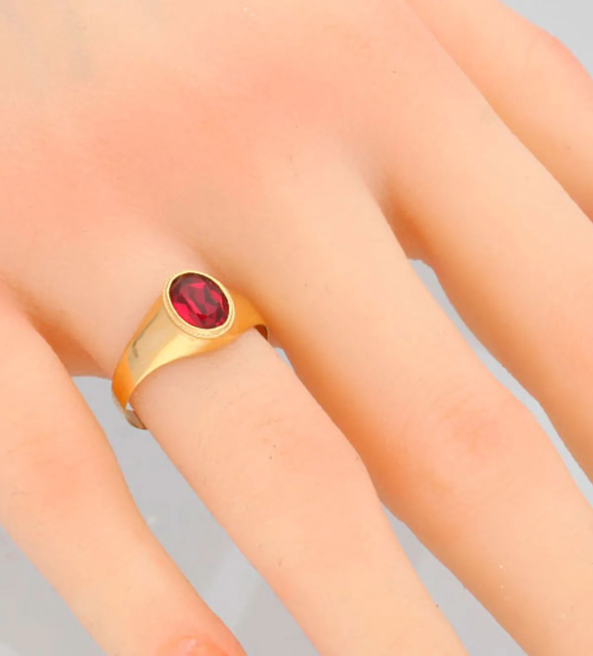 Este anillo de oro presenta un diseño tipo sello, con una piedra sintética color rojo rubí en forma ovalada, engastada en boquilla con un bisel lapidado que aporta un acabado refinado y elegante. El brazo del anillo es liso, limpio y moderno, ideal para manos infantiles sin perder el aire clásico que lo convierte en una joya significativa.