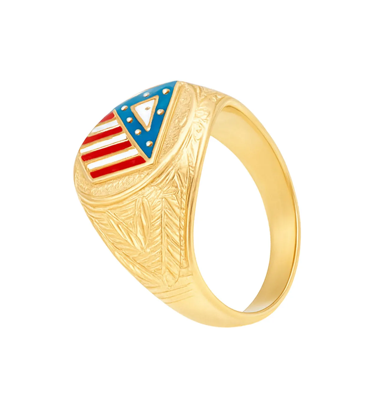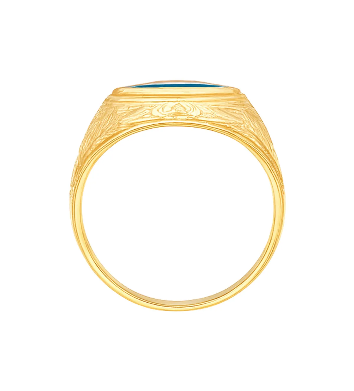 El anillo de oro está elaborado íntegramente en oro amarillo de 18 kilates, garantizando durabilidad, resistencia y un brillo excepcional. El escudo esmaltado, con los colores azul, rojo y blanco, mantiene su viveza con el paso del tiempo gracias a un proceso de esmaltado de alta precisión.