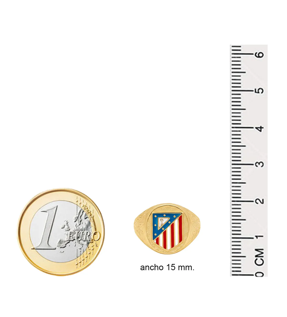 Anillo de oro Atlético de Madrid, una joya poderosa para verdaderos apasionados del fútbol. Fabricado en oro de 18 kilates, con escudo esmaltado en los colores oficiales del club y brazos laureados de acabado lapidado. Un diseño sólido, elegante y personalizable con grabado interior. Ideal para regalar o lucir con orgullo tu pasión colchonera. ¡Solo queda una unidad disponible en el número 13! podemos ajustarlo a otras tallas, consultanos.