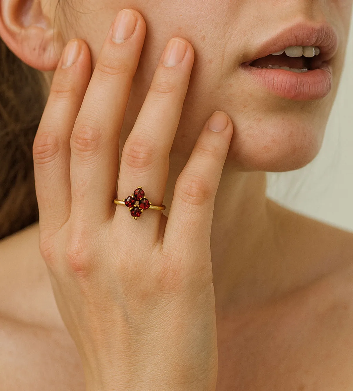 Esta exquisita sortija de oro amarillo de 18 quilates con 4 granates engastados en garras formando un rombo es una verdadera joya de refinada simplicidad. Su diseño sencillo resalta la belleza de los granates, creando un efecto visual cautivador que enriquece cualquier estilo.