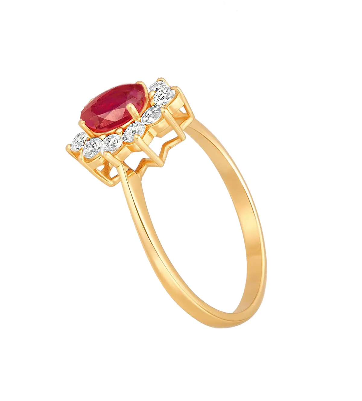 El anillo presenta una composición armónica en la que cada detalle ha sido pensado para ofrecer equilibrio y distinción. La orla de circonitas no solo embellece la pieza, sino que realza el protagonismo del rubí fino, logrando un contraste elegante entre el rojo intenso de la gema y la luz de las piedras que la rodean.